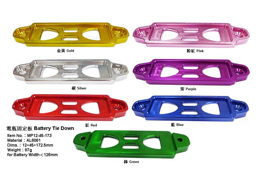 電瓶固定板 Battery stay バッテリーステー 品號:MP12-45-173 材質:鋁合金AL6061 尺寸規格:12×45×172.5 mm 表面處理:陽極金黃、銀、紅、藍、綠、紫、粉紅 重量:87公克 適用寬度小於126mm之電瓶 訂購專線:04-7866284 Line ID:@593btqtd